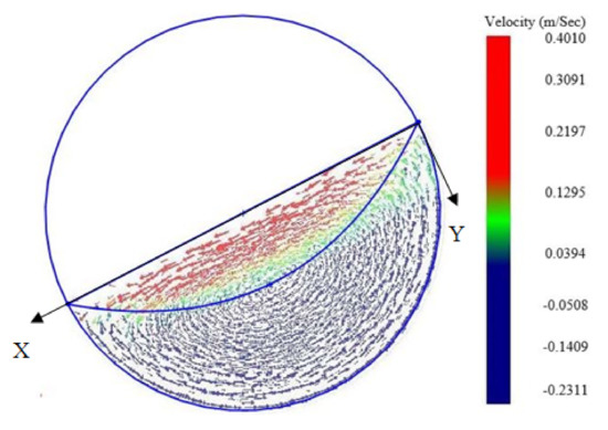 The particles in a cross section of a rotating drum normally exhibit two flow regions: active and passive. To demonstrate the existence of the active and passive regions for the inclined rotating drum, Figure 7 gives the velocity field at a cross section for the drum with α = 10°, where a X-Y coordinates is defined. The velocity is positive if the projection of the vector for the velocity is in the positive direction of the x axis. The length of a velocity is proportional to its magnitude. It can be seen that the velocity of the particles increases with the radial height of the drum from the bottom to the top surface of the bed along the Y axis. This velocity profile is similar to that observed in the experiments and simulation studies for horizontal rotating drums [24,30]. The active and passive regions have been shown clearly in the figure. The two regions have also been observed in other locations for all angles of inclination considered in this work. It should be noted that the rotation speed of 30 rpm and drum diameter of 170 mm constitute to the Froude number of 0.08551. Based on the result obtained in [23] for a horizontal rotating drum, the flow should be in the cascading motion. However, the cascading behavior shown in [23] is not clear in the present study. The possible reason is that the system in this work has different simulation conditions. Further studies will be conducted to understand the flow regimes for inclined rotating drums.