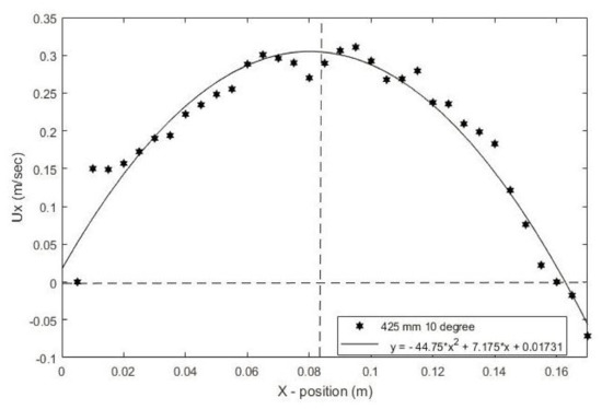 To calculate the area ratio of a rotating drum, the determination of particle velocity profile on the bed surface is important. To analyze the surface velocity profile, locations were first defined at each 50 mm distance along the length of the drum, and then the cuboids of 5 mm × 5 mm × 5 mm were created across the bed surface at each defined location. At each cuboid location, the velocity in the X direction was calculated at t = 30 s. Figure 8 shows the variation of the velocity of particles on the bed surface along the X direction at La = 425 mm for the case with α = 10°. The velocity has the highest value at the central region of the bed surface and very small values at the edges. A similar profile has also been observed in the previous experiment for horizontal rotating drums [24]. It is noted that there is a big jump from the first point to the second. The first point corresponds to the higher end of the surface layer of the bed, where the particles stop and then change the direction of their movements. Therefore, there is a big change in the value of the velocity between the first and second points. The particle velocity ux on the bed surface obtained by the simulation can be fitted by a polynomial function. Based on the velocity profile, B, δ(x) and finally the area ratio can be determined by using Equations (13)–(17). Similar ways can be used to calculate the values of the area ratio at other locations for all angles of inclination.