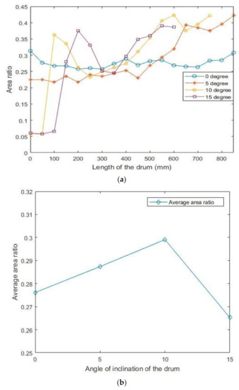 To further demonstrate the impact of the angle of inclination on the area ratio, the average area ratio is calculated and plotted against the angle of inclination of the drum, as shown in Figure 9b. It can be observed that with the increase in the angle of inclination, the average area ratio increases until a peak at α = 10°, thereafter reduces drastically. This indicates that the average area ratio of 10° inclination is the highest compared to other inclinations considered in this study.