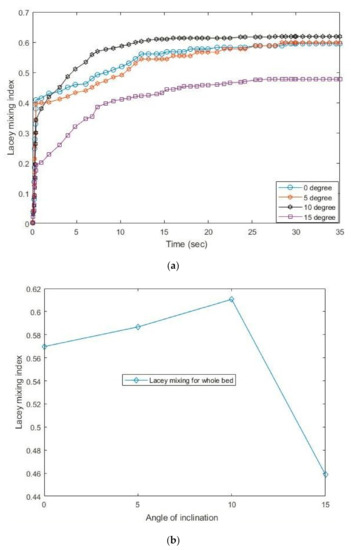(a) Variation of the Lacey mixing index with time for different angles of inclination; and (b) average Lacey mixing index for different angles of inclination.