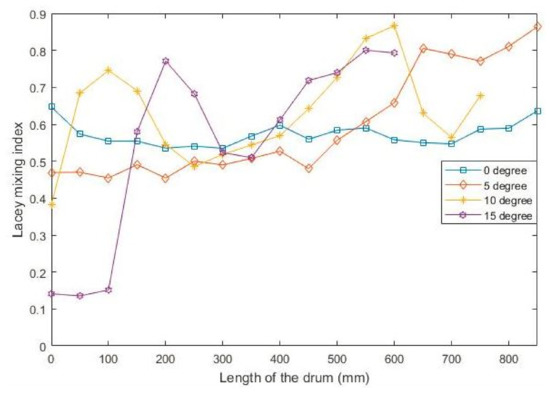 As the inclined rotating drum is a three-dimensional system, it is of importance to understand the Lacey mixing index along the length of the drum. To perform such an analysis, different cuboids of 170 × 170 × 17 mm were defined at cross sections with a 50 mm distance between two neighboring sections along the length of the drum. Each cuboid was further divided into small cubes with the same size as that used to measure the whole bed mixing index. A similar procedure was applied to calculate the Lacey mixing index for each cuboid.