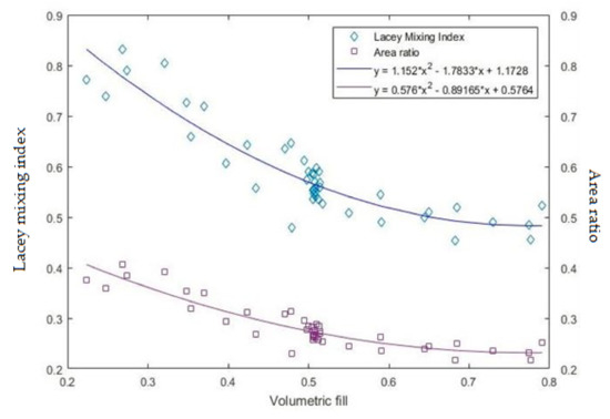 Based on the results shown in Figure 9a and Figure 11, the mixing index and area ratio have a similar variation trend with the length of the drum. They are related to the volumetric fill of particles. To further demonstrate the relations among the three properties, Figure 12 shows the dependence of the area ratio and Lacey mixing index on the volumetric fill from all cases considered in the present study. At a rotating speed of 30 rpm considered in the present work, the volumetric fill of below 20% lies in the slumping flow regime, and above 80% lies in a centrifuging regime. In these two regimes, mixing phenomena rarely occur [23]. Therefore, the data in the two regimes has been excluded when plotting the figure. It can be seen in Figure 12 that both the Lacey mixing index and area ratio can be fitted by quadratic functions, and they decrease with the increase of the volumetric fill. The Lacey mixing index is directly proportional to the area ratio, which is similar to the finding of Xiao et al. [30] for a horizontal rotating drum.