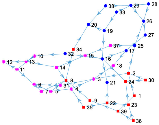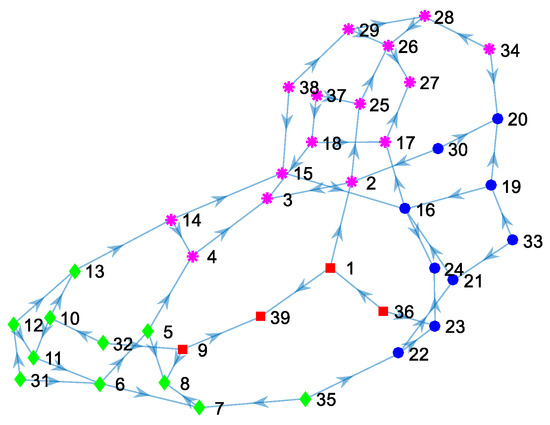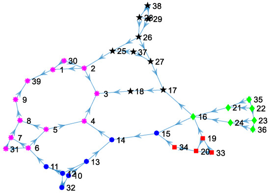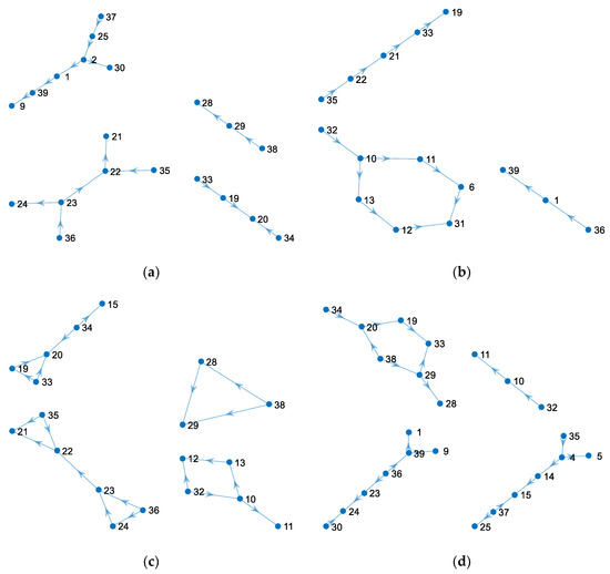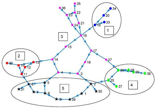 In this section, the present study experiments with the data of IEEE 39-bus power system and establishes the simulation results in detail. The power flow calculation and the isolated island problems are solved using the MATPOWER 6.0 toolkit in MATLAB R2016a [35]. Based on the graph theory, the directed graph gets the average degree , cluster coefficient , and average path length , while the random network with the same , and . The graph includes generator nodes ranging from 30 to 39, and it is partitioned into 5 communities according to the Fast–Newman algorithm. The modularity is , which indicates good community partition of this graph. Each community contains at least one generator node, which is shown as follows.