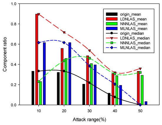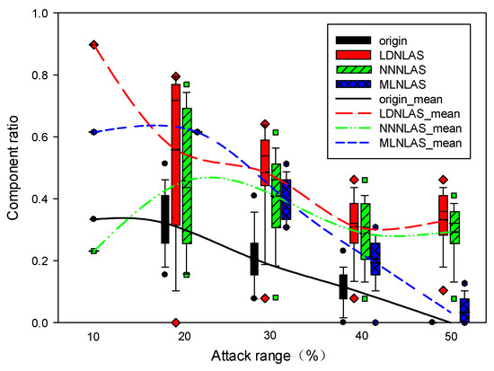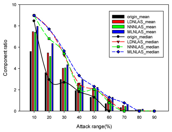 In Figure 7, when the attack range is up to 50%, the original network totally collapses, and the MLNLAS network lefts a few nodes. In contrast, the LDNLAS and NNNLAS networks remain a large number of nodes. Owing to the impacts of the highest degree nodes on the connectivity, the NNNLAS network losses the maximum nodes at 10% attack range of 4 networks. For further analysis, the mean and median values are shown in Figure 8.