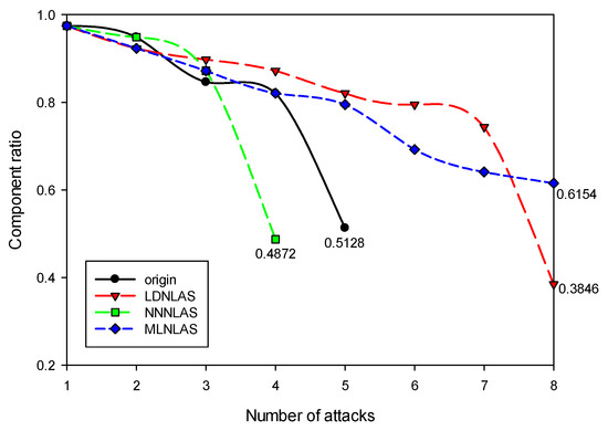 Observing the mean histogram and the median curve of Figure 6, the original network lefts fewer nodes when the attack range is up to 60%. The LDNLAS and NNNLAS networks survive up to 70% attack range, while the MLNLAS network can preserve in 80% attack range. Combined with the distribution intervals of Figure 5, the robustness of 4 networks orders is as follows: MLNLAS > LDNLAS > NNNLAS > original.
