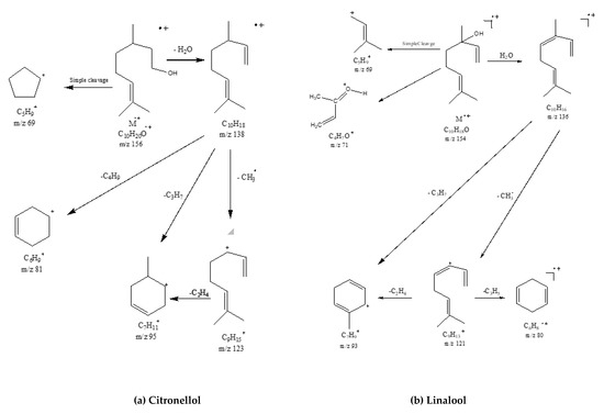 The fragmentation of the main components of P. Graveolens by electron ionization at 70 eV with single quadruple mass spectrometer based on its mass spectra were reported, as shown as in Scheme 1. The compounds investigated in this study fit into two groups. The first group comprises the compounds citronellol, linalool, and eudesmol, which have a hydroxy (OH) group through its structures. The second group comprises menthone and geraniol formate with oxygen as carbonyl—C-O group. Although the last studied compound (rose oxide) has a hetero oxygen atom in six cyclic ring.