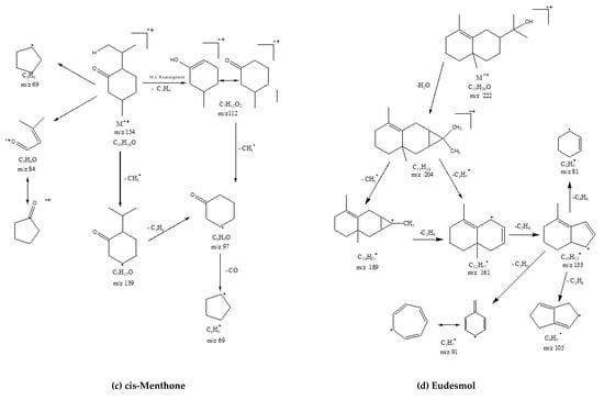 The menthone mass spectrum is shown in Figure 2c. It is clear that the loss of C3H6 with McLafferty rearrangement is eliminated from menthone molecular ion to form the C7H12O+ ion at m/z 112, which represents the base peak in the spectrum. This ion is fragmented by the loss of CH3• radical to form C6H9O+ ion at m/z 97, the latter is fragmented by the loss of CO to form C5H9+ at m/z 69.