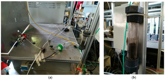 Experimental set-up used in the laboratory. (a) gas cleaning set-up; (b) detail of filter section.