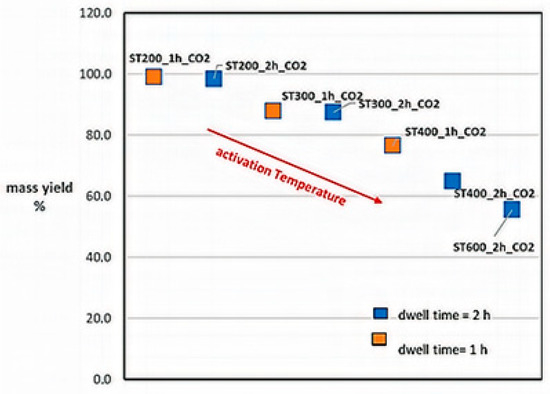 In Figure 5, the mass yield results are reported considering dwell time of 1 and 2h with activation temperature that ranged from 200 °C to 600 °C. The mass yield passed from roughly 99% to 65% when the temperature passed from 200 °C to 400 °C. The optimal condition was settled to 400 °C and 2 h. This was due to the higher characteristic registered. In Table 2 and Table 3 are registered higher specific surface and a higher concentration of alkali metals, such as potassium and alkaline earth metals, such as calcium. These elements, extensively studied in literature are important for the sulphur compounds removal [29,30]. At 600 °C, the activated sample was also tested obtaining better performances, but it was not considered. The main topic in this paper is to design a low cost and low-temperature gas cleaning section; 600 °C is a higher temperature difficult to reach in gas exhausts.