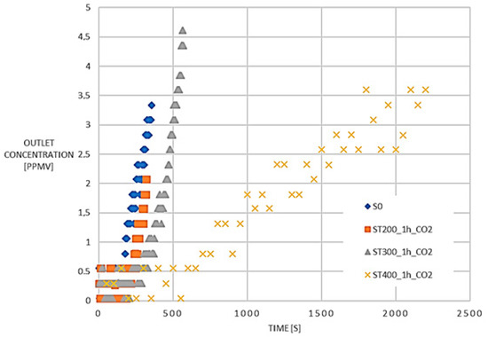 As described before, different temperatures (200–300–400 °C) and dwell times (1–2 h) were fixed for carbon dioxide activation of the sewage sludge. The bed height is 5 cm. In Figure 6 and Figure 7 breakthrough curves for activated samples with carbon dioxide, with one-hour dwell time at 200–300–400 °C are shown. Higher temperature-activated samples show higher breakthrough times.