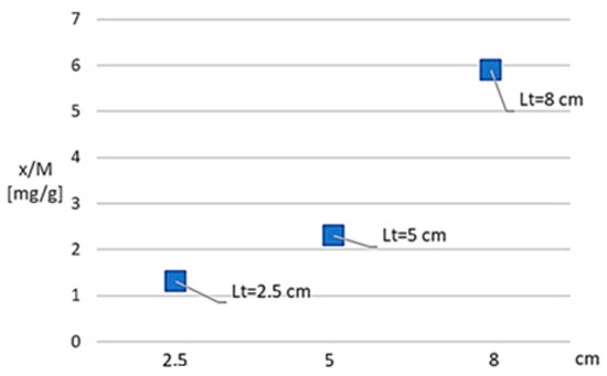 For the activated sample ST400_2h_CO2 bed height effect was investigated too, with three different configurations (Lt = 2.5 cm, Lt = 5 cm, Lt = 8 cm). A breakthrough concentration of 3 ppm(v) was chosen to compare the results. These results show an increase in the adsorption capacity of almost one order of magnitude compared to the lowest bed length. The maximum adsorption capacity is around 5.9 mg/g for the H2S removal of 20 ppm(v) in a simulated biogas mixture (Figure 9). This result is due to the specific surface increasing and concentration of alkali and alkaline earth metals, as demonstrated in literature [31,32,33]. These results highlight how the adsorption capacity is dependent from the bed height. This capacity being weighted on sorbent loaded in the filter is a specific function. There is no dependency on mass loaded but there is a strong relationship on the aspect ratio of the filter. In fact, as reported elsewhere the ratio between the diameter and the bed length of the filter needs to reach a threshold value.