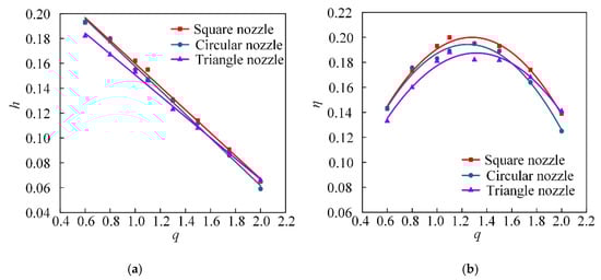 - The square nozzle peak efficiency is 3% higher than that of the circular nozzle and 4.1% higher than that of the triangular nozzle;