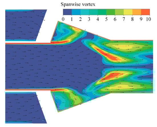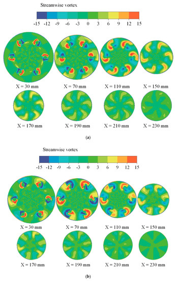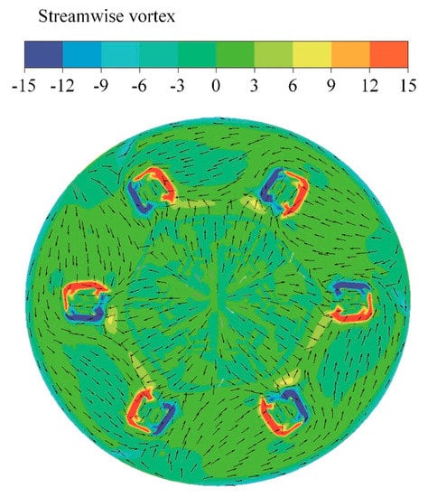 - Compared with the streamwise vortex, the strength of the spanwise vortex is stronger and the overall change is relatively lower. The spanwise vortex is a vortex component that is perpendicular to the main flow direction. Although it also contributes to the mixing effect, it causes a backflow phenomenon and increases friction loss.