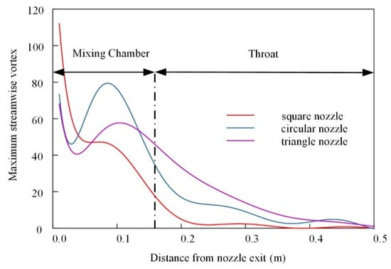 - The streamwise vortex plays a major role in the mixing process and decays to an extremely small value at the end of the throat after decaying rapidly in the suction chamber. Therefore, the greater the streamwise vortex strength is, the higher the device efficiency is.