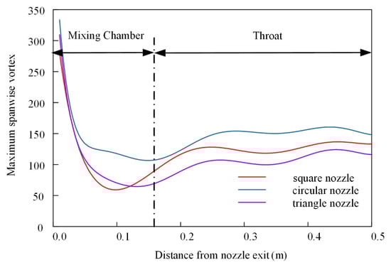 - During the process, the maximum streamwise vorticity peak value of the square nozzle is 31% more than that of the circular nozzle and 39% more than that of the triangular nozzle; the maximum spanwise vorticity peak value of the square nozzle is 19% less than that of the circular nozzle and 12% less than that of the triangular nozzle.