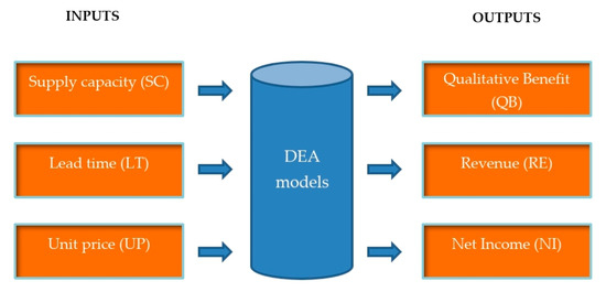 In summary, a graphic of the DEA model for the analysis of DMUs (suppliers) along with three inputs and three outputs is shown in Figure 2. The results of the AHP model for the ranking of various suppliers on qualitative attributes are utilized in the output qualitative benefits of the DEA model [25,26]. In our situation, the inputs are those factors that organizations would consider as an improvement if they were decreased in value (i.e., smaller values are better), whereas outputs are those factors that organizations would consider as improvements if they were increased in value (i.e., larger is better). This is a standard approach when seeking to use DEA as a discrete alternative multiple criteria decision-making tool [26].