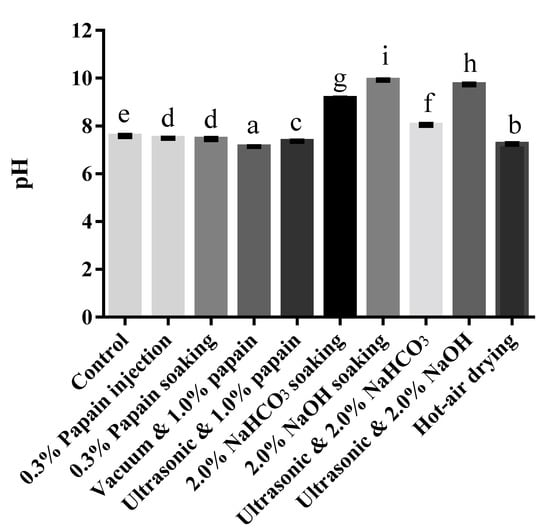 pH of neritic squid muscle treated with different softening methods, versus untreated controls. Different small letters (a–i) indicate significant differences (n = 3; p < 0.05).