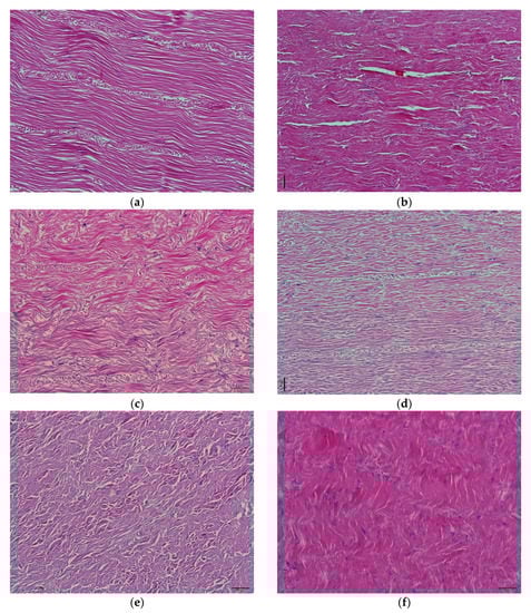 A number of 2–3 mm thick strips of squid mantle subjected to different softening techniques as outlined above were fixed with 10% formalin at 4 °C for 24 h. Dehydration and embedding were performed according to []. Samples were dehydrated in 70%, 90%, and 100% ethyl alcohol for 1.5 h each to remove free water in the fixed tissue, then subjected to two changes of xylene for 1 h each, infiltration in melted paraffin at 60 °C for 30 min, and then embedding in paraffin for 24 h. The block face was trimmed to 5 × 5 × 3 mm. Thick sections (6 μm) were prepared with a rotary microtome (Tissue-Tek VIP5 JR, Sakura, Tokyo, Japan) using a steel knife. Tissue sections mounted on glass slides were dried at 40 °C [] and immersed in two changes of xylene for 10 min each to dissolve the paraffin, then immersed in ethyl alcohol of decreasing concentration: 100%, 95%, 90%, 85%, 80%, and 75% for 5 min each. After washing with distilled and double distilled water, the slides were immersed in a saturated hematoxylin solution for 20 s and washed under tap water for 15 s. The slides were then stained by immersion in eosin (Thermo Fisher Scientific, Kalamazoo, MI, USA) for 45 s, the excess being washed out in tap water. The slides were then dehydrated in ethyl alcohol of increasing concentration −75%, 80%, 85%, 90%, 95%, and 100%, for 10 s each, and then in xylene for 10 sec []. Then, glass cover slips were applied with mounting medium (Micromount, Leica Biosystems Richmond, Inc., Richmond, IL, USA). Observations were done with a compound photomicroscope (BX 53 Upright Microscope, Olympus, Melville, NY, USA) at 200× and 400× equipped with a digital camera (BX 53 Upright Microscope, Olympus, Melville, New York, USA).