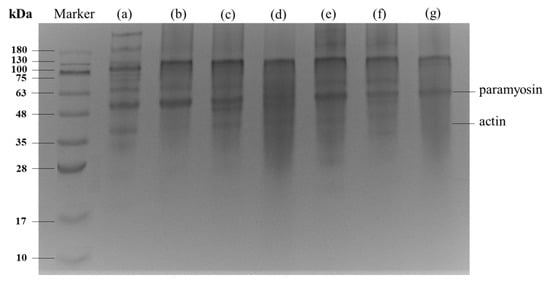 SDS-PAGE analysis of proteins in neritic squid fillets subjected to different softening methods: (a) raw squid; (b) control: untreated sterilized sample; (c) injected with 0.3% papain solution; (d) soaked in 1.0% papain solution in vacuum orbital shaker; (e) 1.0% papain solution in ultrasonic processor; (f) soaked in 2% NaHCO3 solution with ultrasonic cleaning; (g) rehydrated after hot-air drying.