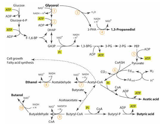- Pyne, M.E.; Sokolenko, S.; Liu, X.; Srirangan, K.; Bruder, M.R.; Aucoin, M.G.; Moo-Young, M.; Chung, D.A.; Chou, C.P. Disruption of the reductive 1,3-propanediol pathway triggers production of 1,2-propanediol for sustained glycerol fermentation by Clostridium pasteurianum. Appl. Environ. Microbiol. 2016, 82, 5375–5388. [Google Scholar] [CrossRef]