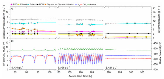 Figure 3 is the graph showing portions of the data with time breaks, to illustrate the oscillations at the three operating conditions with feed glycerol concentration as single variable, where Figure 3A is the off-line HPLC average data of samples taken directly from the CSTR and analyzed (PDO, butanol, ethanol, glycerol) as well as dry cell weight (DCW) and the glycerol utilization rate. Figure 3B is the graph of the real-time redox potential and off-gas (H2 and CO2) concentrations.