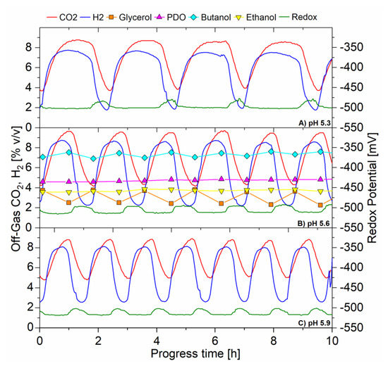 Continuous fermentation showing the effect of pH on the self-synchronized oscillatory metabolism, D = 0.095 h −1, feed glycerol 40 g·L−1 (A) 10 h, pH 5.3 (B) 10 h, pH 5.6 (C) 10 h, pH 5.9. On-line analysis of off-gas (sample frequency 1 min) of: CO2 (red) and H2 (blue), % v/v; redox potential, mV (green). Off-line analysis via HPLC of bioreactor in g·L−1 of: glycerol (solid orange square); PDO (solid magenta triangle); butanol (solid cyan diamond); ethanol (solid yellow inverted triangle).