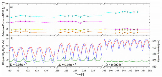 Continuous fermentation showing the effect of dilution rate on the self-synchronized oscillatory metabolism, dilution rate, Temperature 35.5 °C, D = 0.066 h−1 (10 to 156 h); D = 0.080 h−1 (156 to 252 h); D = 0.092 h−1 (252 to 372 h), feed glycerol 31.1 ± 0.5 g·L−1. On-line analysis of off-gas (sample frequency 1 min) of: CO2 (red) and H2 (blue), % v/v; redox potential, mV (green). Off-line analysis via HPLC of bioreactor in g·L−1 of: glycerol (solid orange square); PDO (solid magenta triangle); butanol (solid cyan diamond); ethanol (solid inverted yellow triangle).