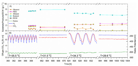Continuous fermentation showing the effect of temperature on the self-synchronized oscillatory metabolism. Operating pH 5.0, D = 0.092 h−1. Feed glycerol: 31.1 ± 0.05 g·L−1 Temperature 35.5 °C (252–537 h); 31.5 °C (537–687 h); 34.3 °C (687–906 h); 29.6 °C (906–1020 h) (A) Off-line analysis of bioreactor in g·L−1 of: glycerol (solid orange square); PDO (solid magenta triangle); ethanol (solid inverted yellow triangle); butanol (solid cyan diamond) (B) On-line analysis of off-gas (sample frequency 1 min) of: CO2 (red) and H2 (blue), % v/v; redox potential, mV (green). Lines joining data points are for visual purposes only.