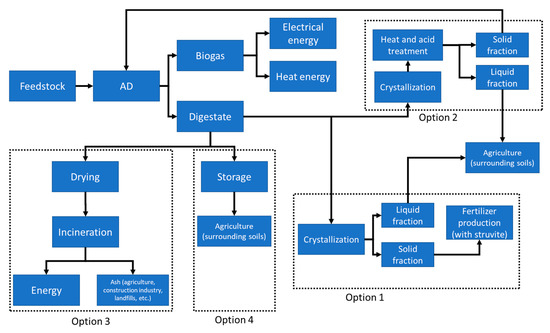 The first two options consider utilization of digestate produced in biogas plant during AD process utilization in two manners: (1) as a replacement of solid fraction for AD feedstock, where biogas yield is increased and corn silage costs reduced (digestate recirculation—Option 2); and (2) as a valuable agricultural fertilizer which contains struvite (Option 1). The process is presented within the experiment conducted by Đurđević et al. [30]. In Option 2, degradation of the lignocellulosic wall in digestate solid fraction occurs due to struvite crystallization process, mechanical separation operations and use of heat-acid treatments. By recirculation of treated solid fraction to AD reactor, as a feedstock replacement for corn silage, final biogas yield is increased and feedstock costs reduced. In Option 1 the process is the same as in Option 2, only the treated digestate is used as a fertilizer on agricultural soils due to newly formed materials (magnesium ammonium phosphate hexahydrate and calcium phosphate dihydrate). It is also important to mention that after separation to a solid and liquid fraction in these processes, digestate liquid fraction can be used on agricultural soils as a fertigation liquid, which helps improve the characteristics of the soil [31,32].