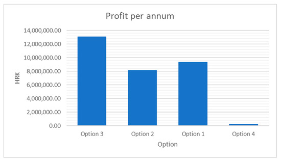 Option 3 (digestate incineration) has higher costs—mainly due to small feedstock amounts used for the process [25], but also due to maintenance of the plant. CAPEX amounts to 9,000,000 HRK, while OPEX and maintenance costs amount to 1,000,000 HRK and 900,000 HRK annually, respectively [25,37]. CAPEX in this case includes reactor, dryer, and scrubber construction, while OPEX includes chemicals necessary for operation, electric energy, maintenance, and personnel costs.