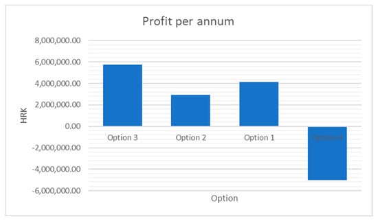 Option 4 considers standard biogas plant with CAPEX of 6,000,000 HRK for 1 MWel plant and OPEX and maintenance costs of 1,500,000 HRK and 500,000 HRK annually, respectively. In this case, CAPEX includes construction of the AD reactor, while OPEX includes chemicals, feedstock (corn silage), and additional energy required for operation (additional to generated on-site), maintenance, personnel costs, and costs for digestate management. Since one of the feedstocks used is corn silage (mostly used), it is important to mention its costs on the market, which annually amount to around 3,000,000 HRK. From the revenue side, this options only has the revenue from selling electrical energy to EPS at incentive prices, which annually amounts to approximately 9,000,000 HRK (with plant operation at 7500 h per annum).