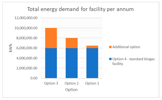 From a financial perspective, energy consumption was also examined for each option (Figure 5). This is significant due to prices of electrical energy in order to compare the costs of energy consumption for each option. Figure 5 presents how much additional energy demand each of the options requires (plant upgrade—Additional option), on top of energy demand of standard biogas plant. It shows that Option 1 (fertilizer production) has the lowest additional consumption on Option 4 (standard biogas plant). Options 2 and 3 have higher energy demands because these processes require energy input in the system for it to operate independently.