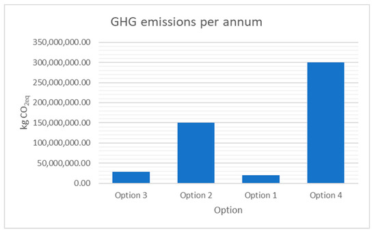 By analyzing the potential and possible option for an observed biogas plant, GHG emissions per year are defined, which can be noticed in Figure 6. Figure 6 presents how much additional GHG emissions each of the options produces (Additional option), on top of GHG emissions of standard biogas plant. The figure shows how the least climate impact in terms of GHG emission has Option 1 (fertilizer production). This result could be related to the reduced need for landfilling and utilization of digestate as an upgrade fertilizer used on agricultural soils, where it presents a source of slow-release, high-quality mineral, with significantly reduced impact on GHG emission production.