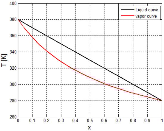 y denotes the vapor mole fraction of the lighter component equilibrium with the liquid mole fraction of the component x (see Figure 6). The mole fractions x and y can be obtained by Raoult’s rule. This rule states that the partial pressure of a component over a solution is the product of the vapor pressure of that component and the mole fraction of this component [20]. The parameter As is calculated by the following equation: