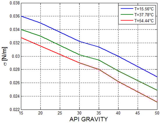 The surface tension of the crude oil at three different temperatures: 15.56 °C, 37.78 °C, and 54.44 °C as a function of API (see Figure 11) [26].