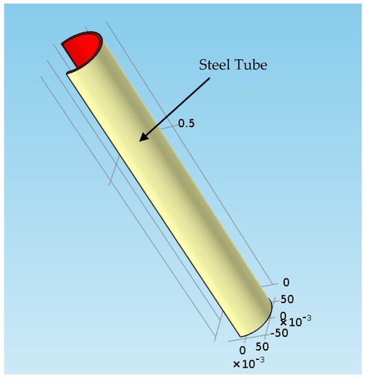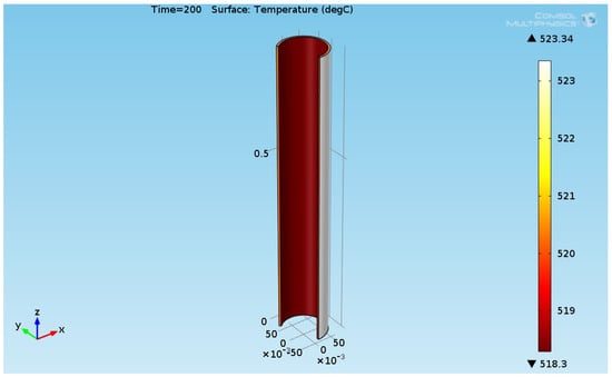 A thermal structural analyses study has been performed in order to analyze the influence of the radiative and convective heat flux on the reboiler tube structural integrity. The calculated external convective coefficient of gaseous mixture, obtained by the algorithm described in Section 2.6 is 78.3 W/(m2·K). The overall emissivity obtained by Equation (32) is 0.42 for distance of 6 m. The COMSOL software has been loaded with the thermal loads (convective and radiative heat fluxes). The numerical results for the temperature Von-Mises stress are presented in this section. Figure 24 shows the 3D temperature field inside the steel tube.