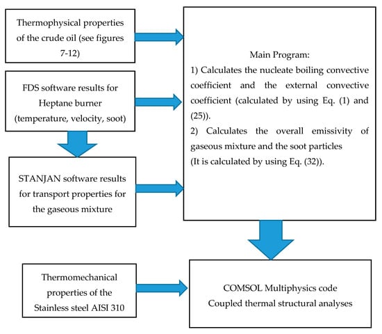 The algorithm is composed of four modules. FDS output file which contains the Heptane flame simulation data, Stanjan software which evaluates the thermo-physical properties of the burned mixture (thermal conductivity, kinematic viscosity etc.), COMSOL Multi-physics transient axi-symmetrical model which performs Heat transfer and structural analyses [41], and the main program which calculate the nucleate boiling convective coefficient and the convective coefficient of the external flow (the gaseous mixture produced from Heptane burning). It provides the required heat loads for COMSOL Multiphysics computation. The schematics of the COMSOL computational process algorithm is shown in Figure 17.