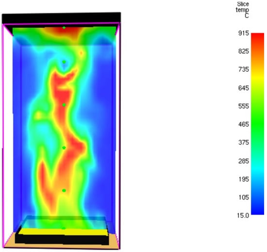FDS software has provided detailed information results regarding the Heptane burner performance. The results include the local and transient gas velocity, gaseous mixture temperature, soot concentrations, radiative heat flux, and convective heat flux. The temperature field at t = 80.5 s is shown in Figure 18 (It will be shown later that in this time interval, the radiative heat flux is maximal).
