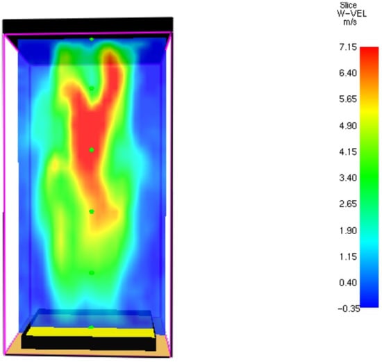It can be seen from this figure that the maximal temperature at time = 80.5 s reaches to 915 °C. The peak temperature results obtained by FDS software (915 °C) has been compared to the literature. It is claimed that typical post-flashover room fire will have more commonly a peak temperature of 900 to 1000 °C (1652 to 1832 °F) [31]. At the flame center the temperature is higher. The velocity field of flue gases at t = 80.5 s is presented in Figure 19 (It will be shown later that in this time interval, the radiative heat flux is almost maximal).