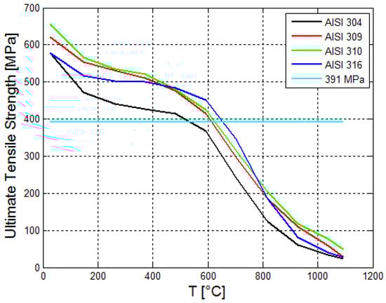 Plot of ultimate tensile strengths (UTS) of several stainless steels compared to the stress obtained by COMSOL software (horizontal line) shown as a function of temperature (The thermo-mechanical data were taken from Reference [43]).