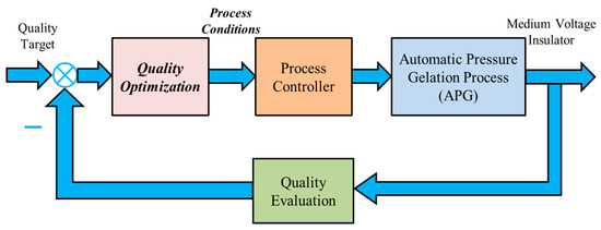 Figure 1. Under the optimization framework, the role of the quality model is substituted by direct online measurements, and the model-free quality optimization methodology is elaborately designed and implemented. As the optimization process progresses, the quality target of medium voltage insulators could be achieved iteratively. Each iteration consists of four stages, i.e., process parameters tuning, experimentation, quality evaluation, and feedback. For this strategy, each iteration has a specific experimental cost. For a type of batch process with short cycle time and low operational cost, the optimization is not sensitive to the iteration number. Thus, a number of limited iterations for quality control are tolerable.