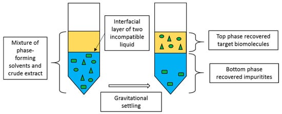 Liquid biphasic system (LBS) or commonly known as aqueous two-phase system (ATPS) has been long introduced for the separation, recovery, and purification of biomolecules, and it is the current research trend adopted in the separation and purification technology. It was started back in 1896 when Martinus Willem Beijerinck accidentally mixed an aqueous starch solution with gelatin and found that an immersible layer was formed between both the aqueous solutions [15,16]. This idea of LBS as an analytical separation technique was sparked by Per-Åke Albertsson in the 1960s who discovered the phenomenon by mixing two different polymers (e.g., polyethylene glycol and dextran) resulting in an aqueous medium containing two separable phases [15,17,18]. This application was then extended to several generations of scientists and engineers who have been working in the industrial biotechnology field. Figure 1 shows a schematic diagram of the principles of LBS.