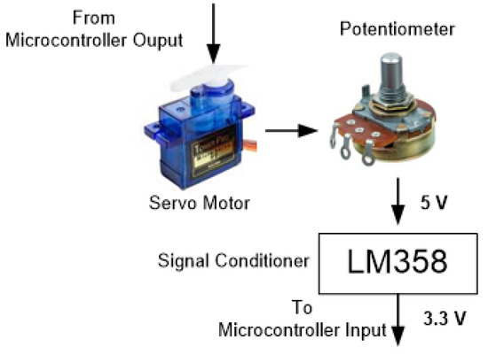 The output for the SOFC simulator is designed using a potentiometer coupled with a servo motor actuator. As shown in Figure 2. This circuit produces an output value from the SOFC simulator between 0 and 3.3 volts, because the micro input works at a maximum of 3.3 volts. The SOFC simulator design consists of an input part (temperature, current, and flow rate of the two gases); the processing part is the Arduino Nano microcontroller; the output part is hydrogen pressure, oxygen pressure, and SOFC voltage.
