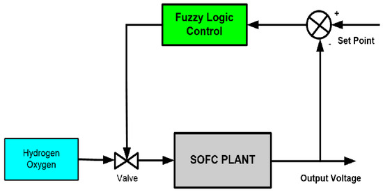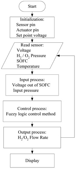 The basic rules of fuzzy logic control (FLC) in this software are to regulate the flow rate of hydrogen and oxygen. FLC is designed to match the characteristics of the SOFC simulator. The output of this FLC is the angle value of the hydrogen/oxygen channel valve rotation. The valve output produces a voltage of 0–5 volts according to the microcontroller input characteristics [11,12].