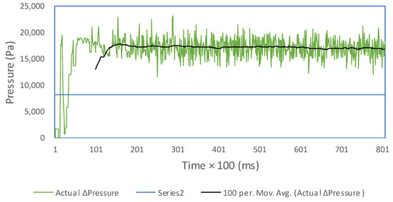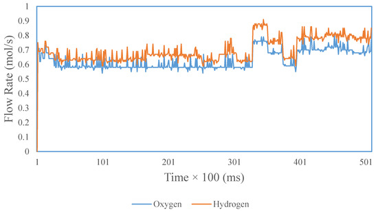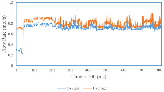 The SOFC simulator is tested using a controller with an input current (external current) of 300 A and a temperature of 1273 K. Graphs of output voltage, flow rate, and hydrogen–oxygen pressure are shown in Figure 14, Figure 15, Figure 16 and Figure 17.