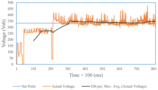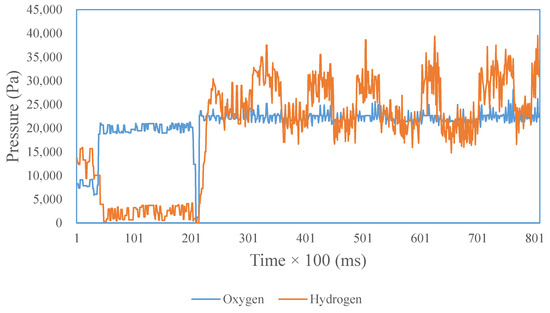 The average value of the SOFC output voltage can be corrected by the controller to the 333 volt set point from 352.09 to 340.60 volts. Hydrogen–oxygen pressure value can be controlled in the range of 4000 Pa, from 17,122 to 4428.68 Pa. Furthermore, the flow rates of hydrogen and oxygen produced in uncontrolled testing are 0.67 and 0.79 mol/s and can then be controlled to 0.72 and 0.79 mol/s. The hydrogen–oxygen pressure difference (∆Pressure) is below 0.08 atm or 8106 Pa [6]. Comparison of the test results is shown in Table 8.