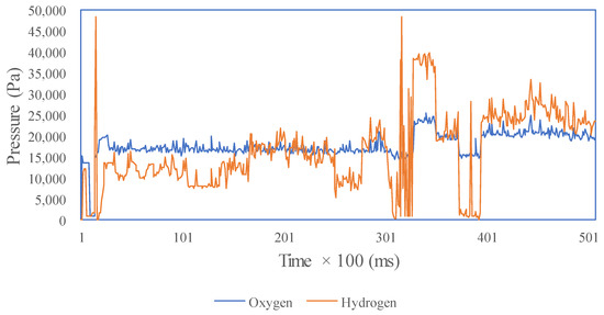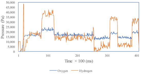 The average values of the test results are shown in Table 4. The average SOFC output voltage does not reach the set point value of 333 volts. The difference in pressure (∆pressure) of hydrogen–oxygen exceeds 8000 Pa. The flow rates of hydrogen and oxygen are 0.79 and 0.67 mol/s.