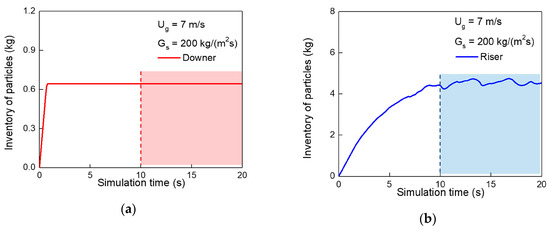 Time evolution of the particle inventory inside the circulating fluidized bed (CFB) downer and riser. (a) Downer; (b) riser.