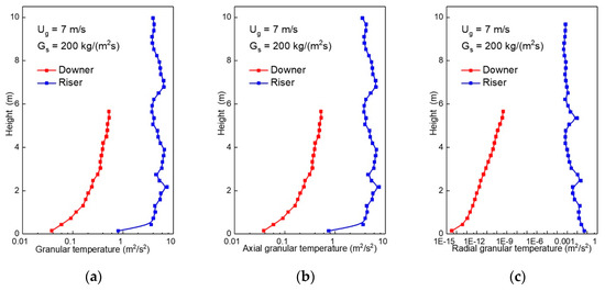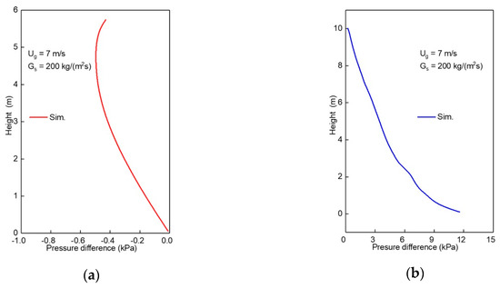 The axial distribution of the time-averaged pressure difference inside the downer and riser were shown in Figure 3. The pressure difference between the bed and the inlet is defined as (P0-P), where P0 is the time-averaged pressure at different heights and P is the operating pressure at the inlet (101,300 Pa) as shown in Table 1. In the downer, the pressure decreased significantly from the inlet to the middle part and then increased to the outlet. This trend was consistent with the experimental study by Zhang et al. [9]. In the riser, the pressure decreased from the inlet to the outlet, which was in accordance with the study by Wang et al. [37]. The difference of pressure from the inlet to the outlet was the driving force for the upward gas-solids flow.