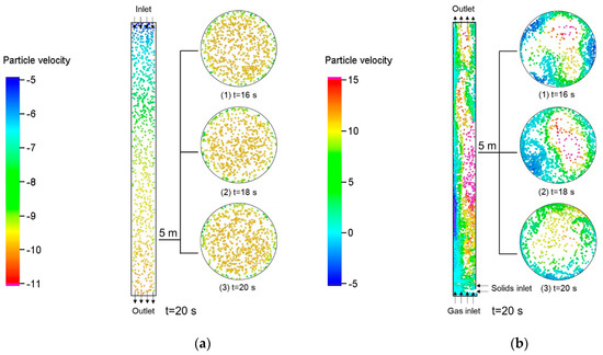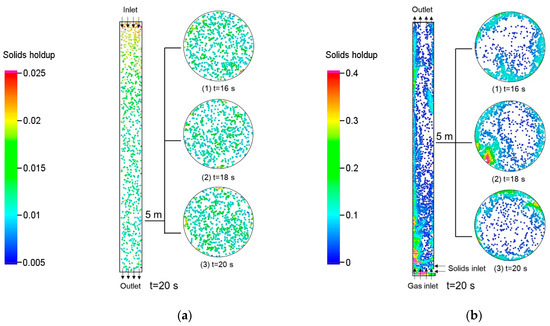 As a method based on the Eulerian–Lagrangian framework, the CPFD approach can track the motion of individual particles and analyze the characteristics of particles in detail. As demonstrated in the previous works [28,30], the gas-solids flow pattern of downer and riser can be out of the influential region of the inlet structure at the axial position of 5 m from the inlet. Therefore, the following discussions would focus on the simulation results at this height of 5 m. The instantaneous solids holdup, which is the solids holdup at a specified time, was compared in the downer and riser. The predicted overall and local distributions of the cross-sectional solids holdup in the downer and riser are shown in Figure 4. In order to better demonstrate the simulation results, the particle size in the downer and riser were scaled up by six times and 12 times respectively. Different colors indicated different particle concentrations. From the axial distribution of solids holdup in the downer, it can be seen that particles tended to gather near the inlet region. According to the equation of calculating the solids holdup (), when the solids mass flux (Gs) is fixed, the lower the particle velocity, the higher the solids holdup. Thus, higher solids holdup near the inlet region may cause the physical phenomenon that is particle gathering near the inlet. As the particles flowed downward, particle concentration decreased to a nearly constant value. In the radial direction, particle concentration distributed uniformly. In the CFB riser, the CPFD approach predicted “bottom dense and top dilute” flow structure in the axial direction, which was also observed by previous experimental study [38]. In the radial direction, particles were concentrated and aggregated together to form clusters both in the center and near the wall. More clusters were predicted near the wall than in the center, and the dispersed particle phase tended to be present in the center, resulting in diluted particle concentration in the central area and higher particle concentration near the wall. At the same operating condition, the solids flow was more uniform in the downer compared to the riser along the axial direction. Although the solids holdup in the downer was much lower than that in the riser under the same operating condition [28,30], the clustering phenomenon with a small amount of particles aggregating together can still be observed from the Figure 4a. The size of clusters in the downer was much smaller than that in riser.
